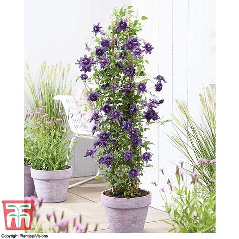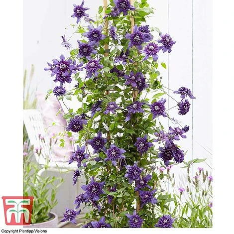 Clematis ‘Kokonoe’ is a brand new variety, and sister to our best-selling Clematis ‘Taiga’! Opulent, double blooms with rich, violet purple petals produce a luxurious display. The earliest blooms emerge as singles, but as the season progresses the flowers become more double, taking on a pom-pom appearance by late summer. Flowering from June to October, this showy climber makes a fabulous patio plant, trained onto an obelisk or scaling walls and fences. Undemanding and easy to prune – simply cut back the stems to just above ground level each year. Height: 250cm (98″). Spread: 100cm (39″). Pruning group 3.