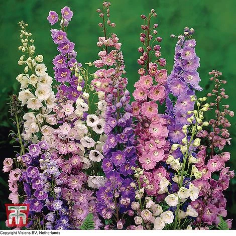A distinguished delphinium producing strong spikes of semi-double blooms in a dreamy blend of pink, lilac, purple, violet-blue, sky-blue and white. Delphinium ‘Pacific Giants’ are excellent for cutting and add structure and presence to the back of cottage garden perennial borders. Height: 150cm (60″). Spread: 75cm (30″).