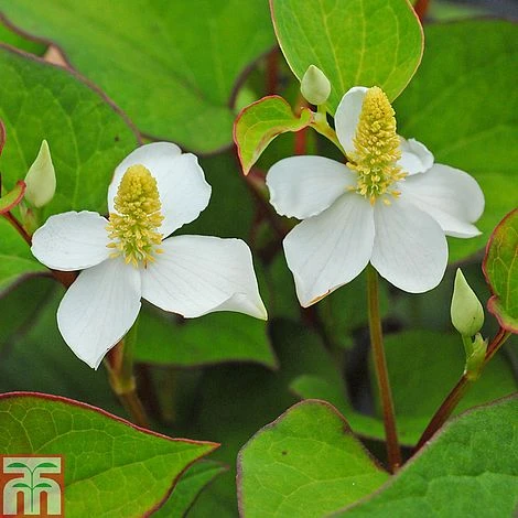 A charming ground cover perennial with aromatic, heart shaped foliage and mahogany red stems. Throughout summer, pristine white flowers sit atop each stem, contrasting elegantly with the dark green leaves. Houttuynia cordata has a vigorous, spreading habit that will quickly form a dense carpet where conditions are favourable. This hardy perennial is extremely versatile, thriving almost anywhere from thin, dry soils to the wet margins of ponds. Height: 30cm (12″). Spread: 100cm (39″).
