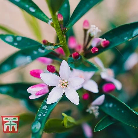 Both the blooms and the foliage of Eriostemon myoporoides have a fresh, zesty fragrance which could easily be described as gin and tonic scented! This half hardy shrub blooms in winter and spring with delicate star-shaped flowers above a bushy mound of linear evergreen foliage. Also known as wax flower, it’s long been a favourite spring stem with florists for its long-lasting blooms and heady fragrance. This shrub can be kept compact, as it not fully hardy it’s a great addition to a conservatory where it will provide winter interest. You can also grow it outdoors throughout the year, as long as it is in a sheltered location where it will not be subject to frost or harsh conditions. Height: 2m (6’). Spread: 2m (6’).