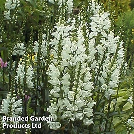 This charming perennial has swaying, vertical spires which from July to September are decked in pristine, white flowers, resembling a snapdragon. The tubular flowers are arranged along the flower spike in four vertical tiers and each individual flower is able to turn towards the sun. This curious feature is also the origin of its common name, the ‘Obedient Plant’: if you bend the flowers left or right, they obediently stay in position as though on a hinge. Physostegia virginiana ‘Alba’ is a lovely addition to informal flower beds or borders, extending their performance through to later in the season. Rich in pollen, it is especially attractive to bees. Height: 60cm (24”). Spread: 40cm (16”).